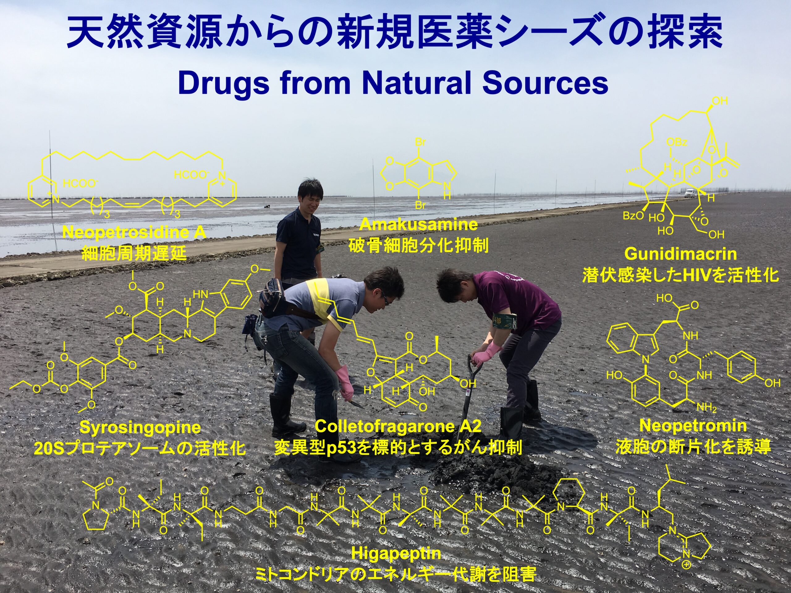 これまで人類は、植物、微生物、海洋生物などの天然資源から、医薬品として役立つような有用物質を発見し活用してきました。そこで私たちは、薬として役立つような天然物を天然資源から探索しています。研究の材料として、微生物や海洋生物を主に用いています。これまでに研究室では、天然資源から「ユビキチン-プロテアソームシステムを標的とする化合物」、「p53を標的とする化合物」、「細胞周期を阻害する化合物」、「破骨細胞の分化を抑制する化合物」などを発見してきました。写真は干潟の泥を採取している様子です。泥から微生物を単離して研究の材料としました。
