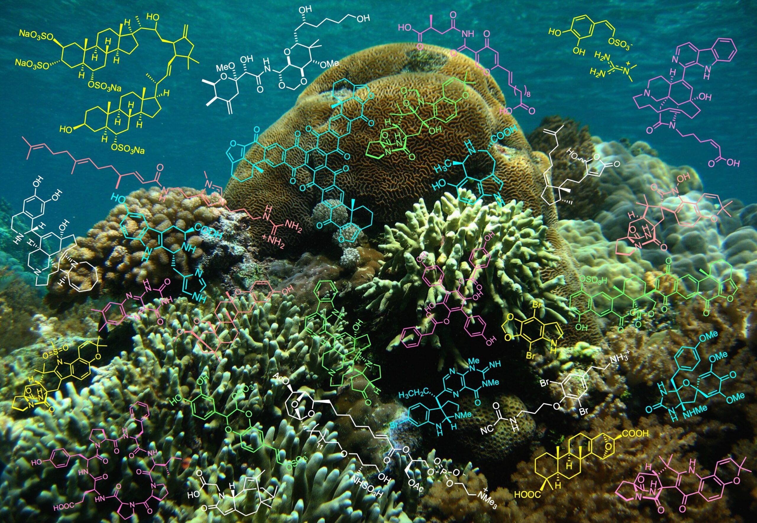 海洋生物は、捕食、生体防御、種族維持、共生などため、様々な化学物質を活用して生きています。図に示した化合物は、研究室で海洋生物から発見したものです。