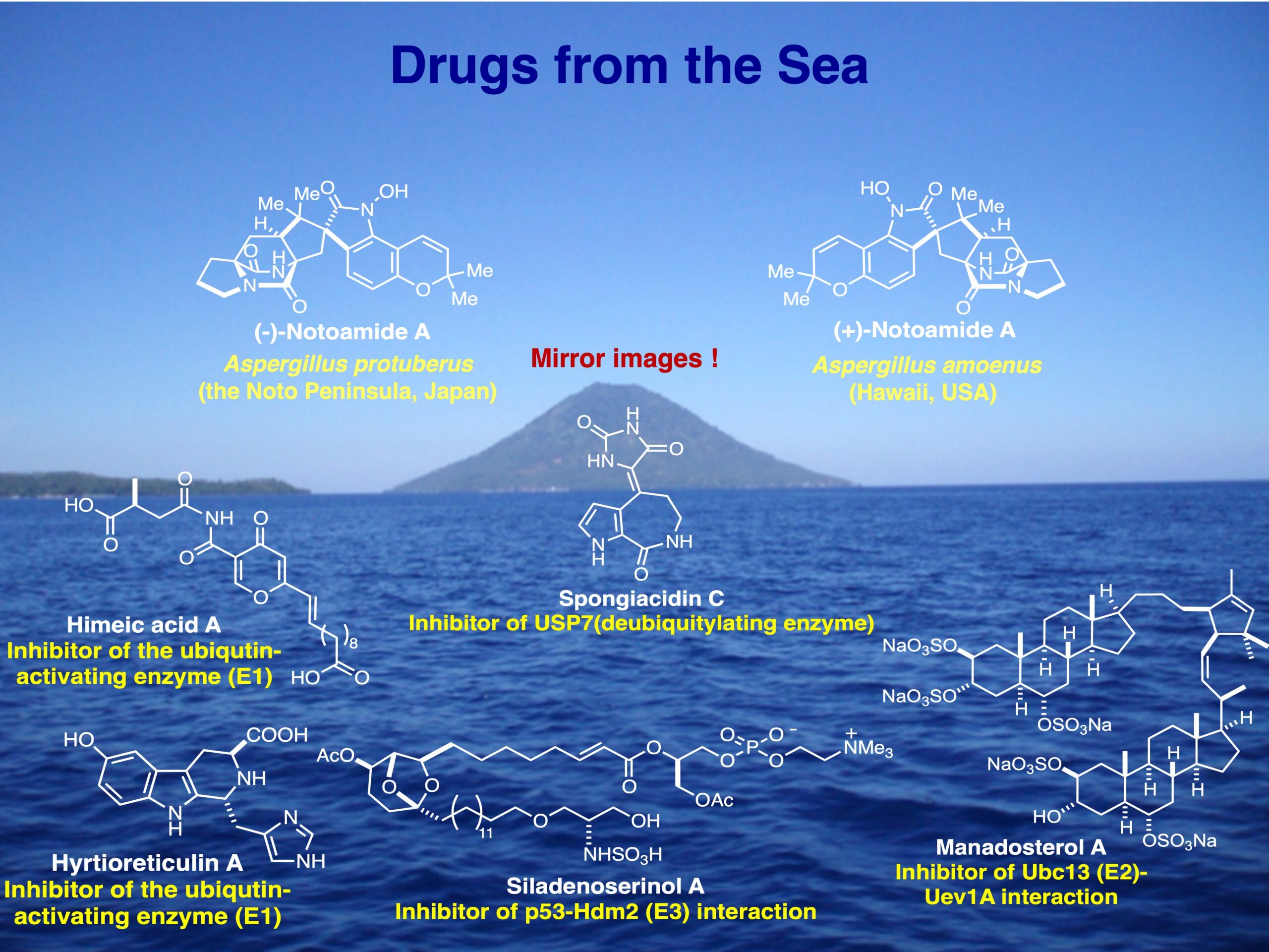 研究室で海洋生物(海綿、ホヤ)や海洋由来真菌から単離した、ユビキチン-プロテアソームシステムに対する阻害物質(himeic acid A, hyrtioreticulin A, manadosterol A, siladenoserinol A, spongiacidin C)です。 私たちが、二枚貝から単離した真菌 Aspergillus protuberus から単離した notoamide の鏡像異性体が、ハワイのキノコから単離された A. amoenus から単離されました。
