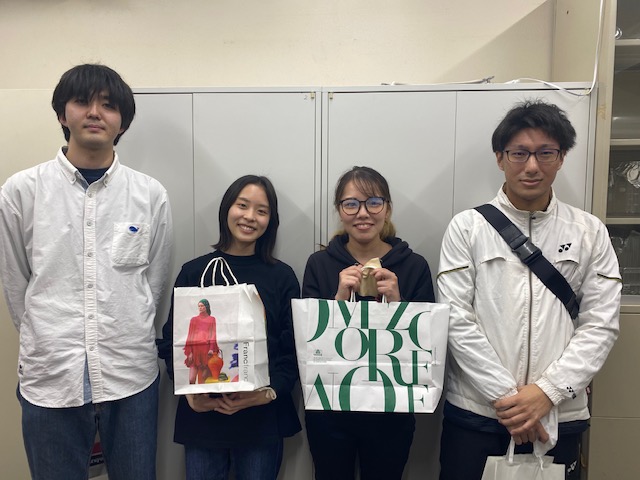 2023年3月22日 卒業・修了生(岡本M2、本田M2、田邉B6、前山B6)に記念品を、お子さんが誕生した貞廣研究員にお祝い品を渡しました。