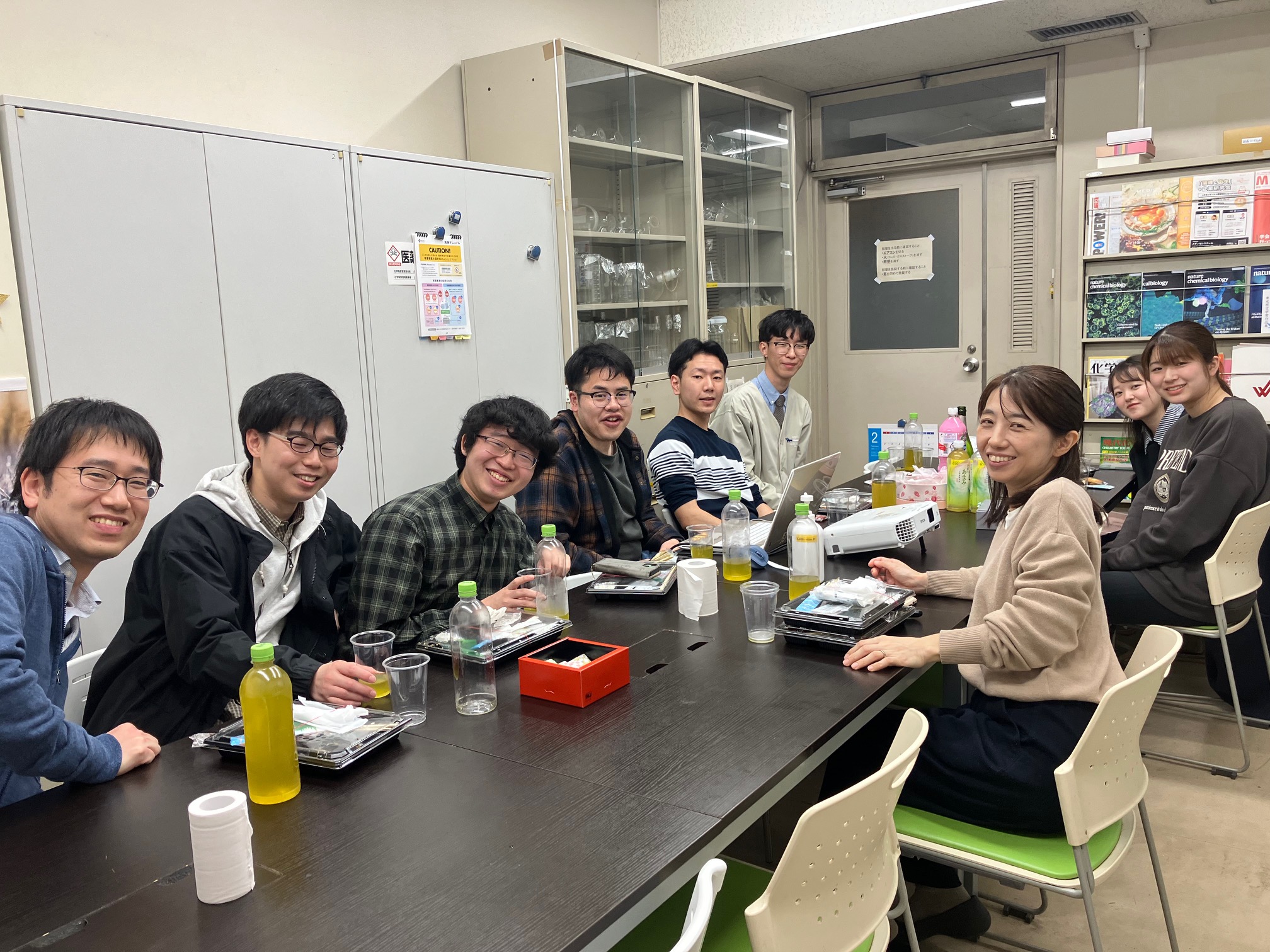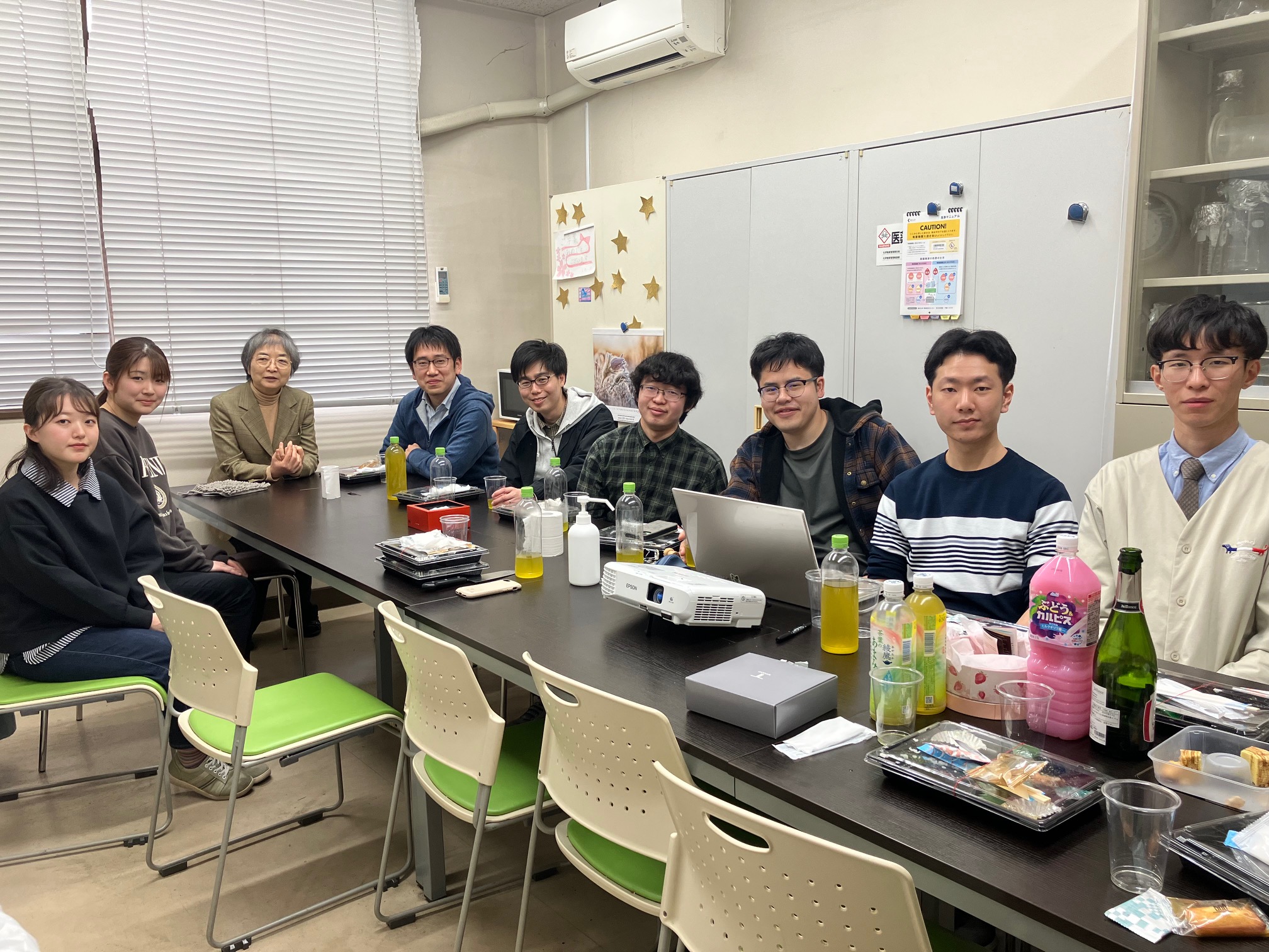 - 2025年3月24日 お花見:昨日、熊本で開花宣言がありました。今日、近所のサクラ公園でお花見をする予定でしたが雨でしたので研究室で桜の映像を見ながら「お花見」しました。