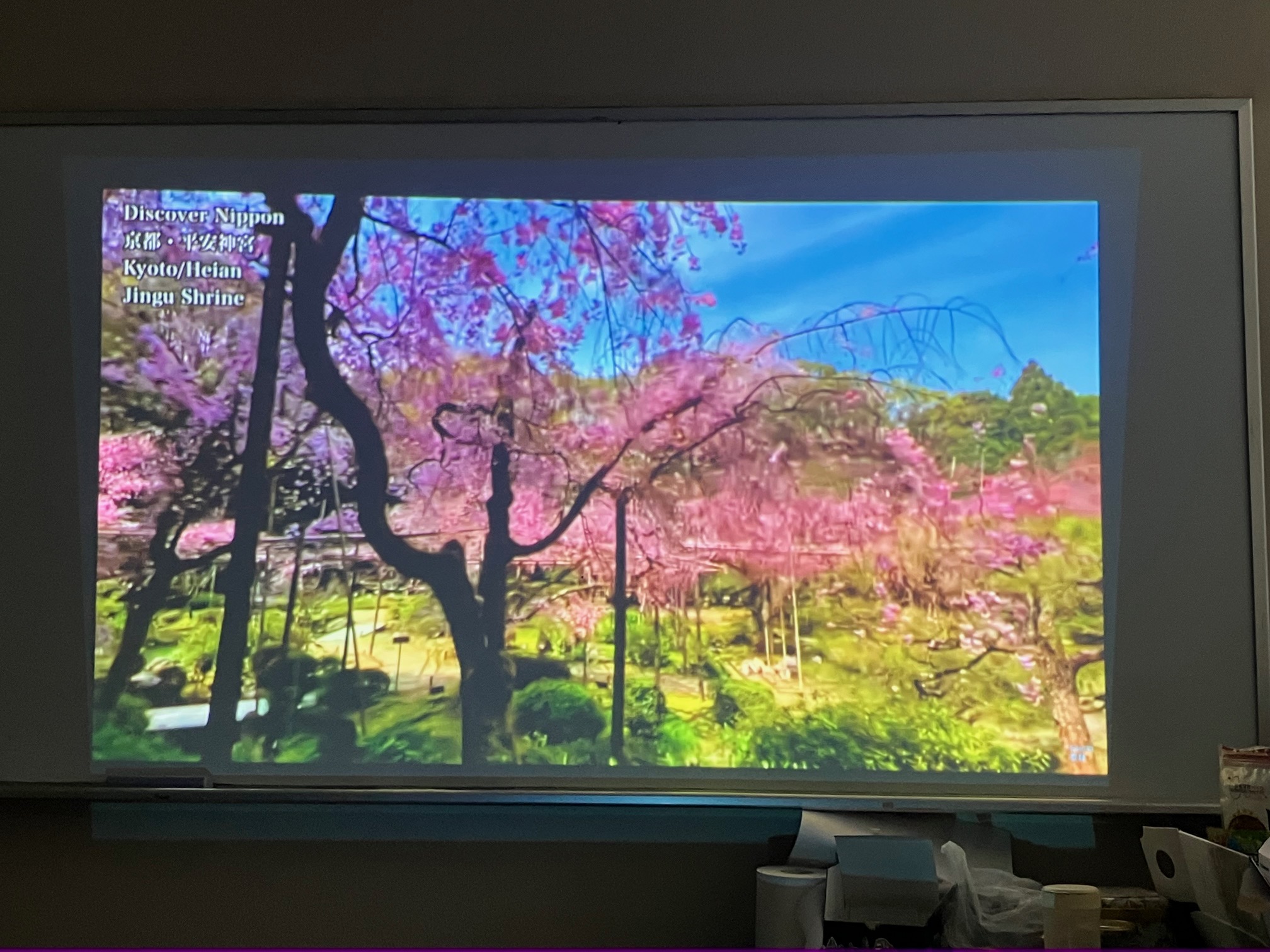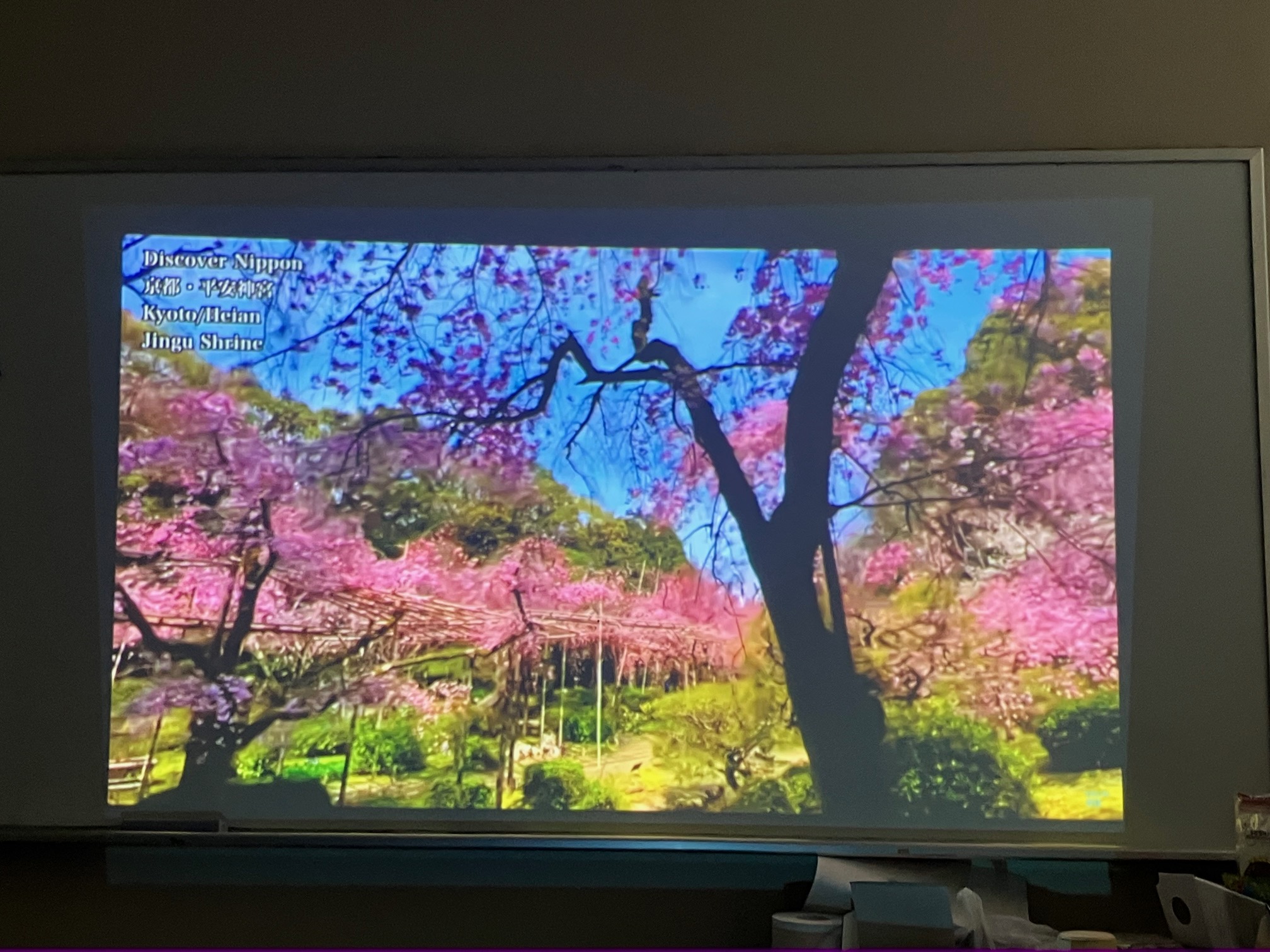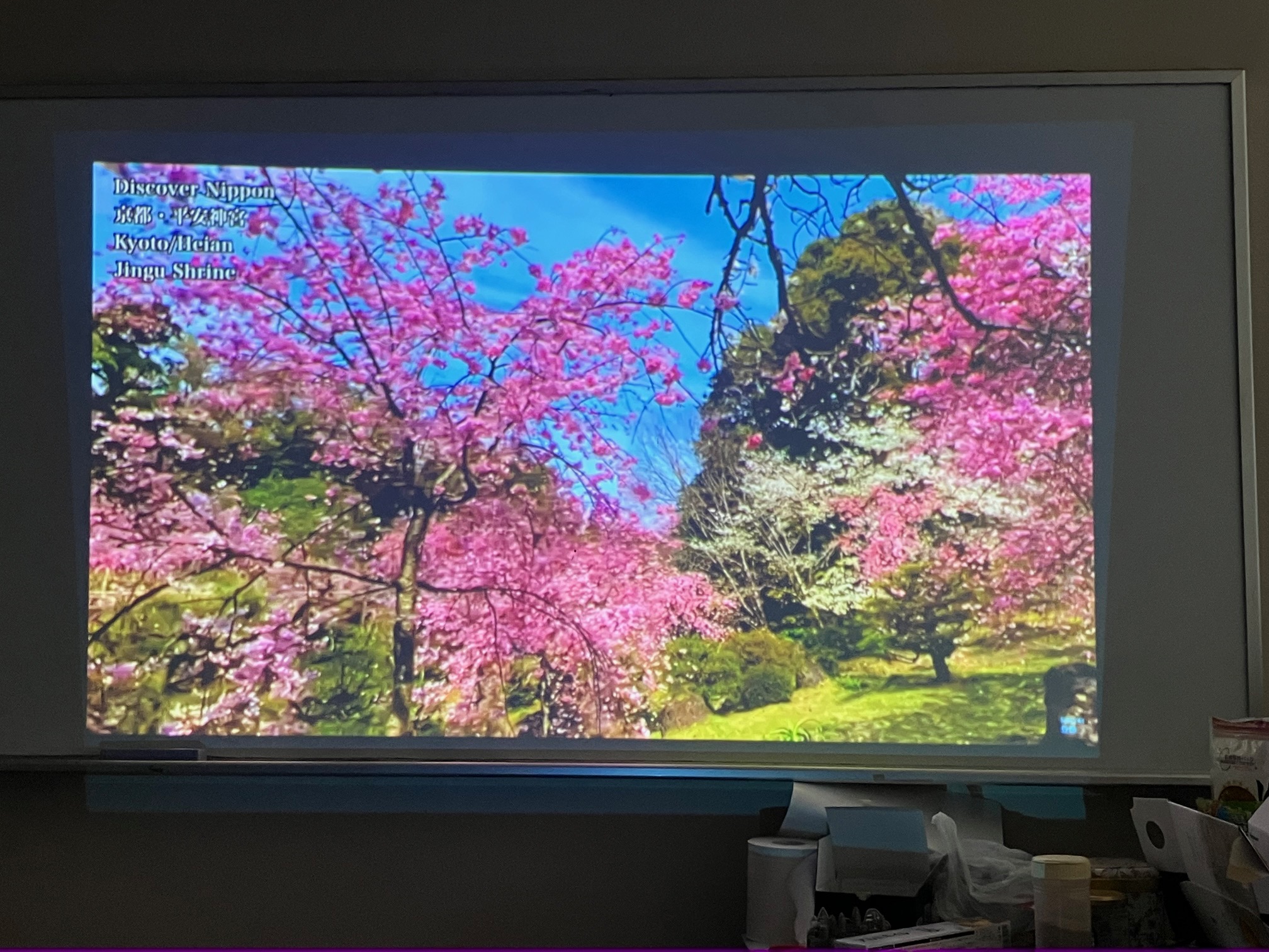 2025年3月24日 お花見:昨日、熊本で開花宣言がありました。今日、近所のサクラ公園でお花見をする予定でしたが雨でしたので研究室で桜の映像を見ながら「お花見」しました。