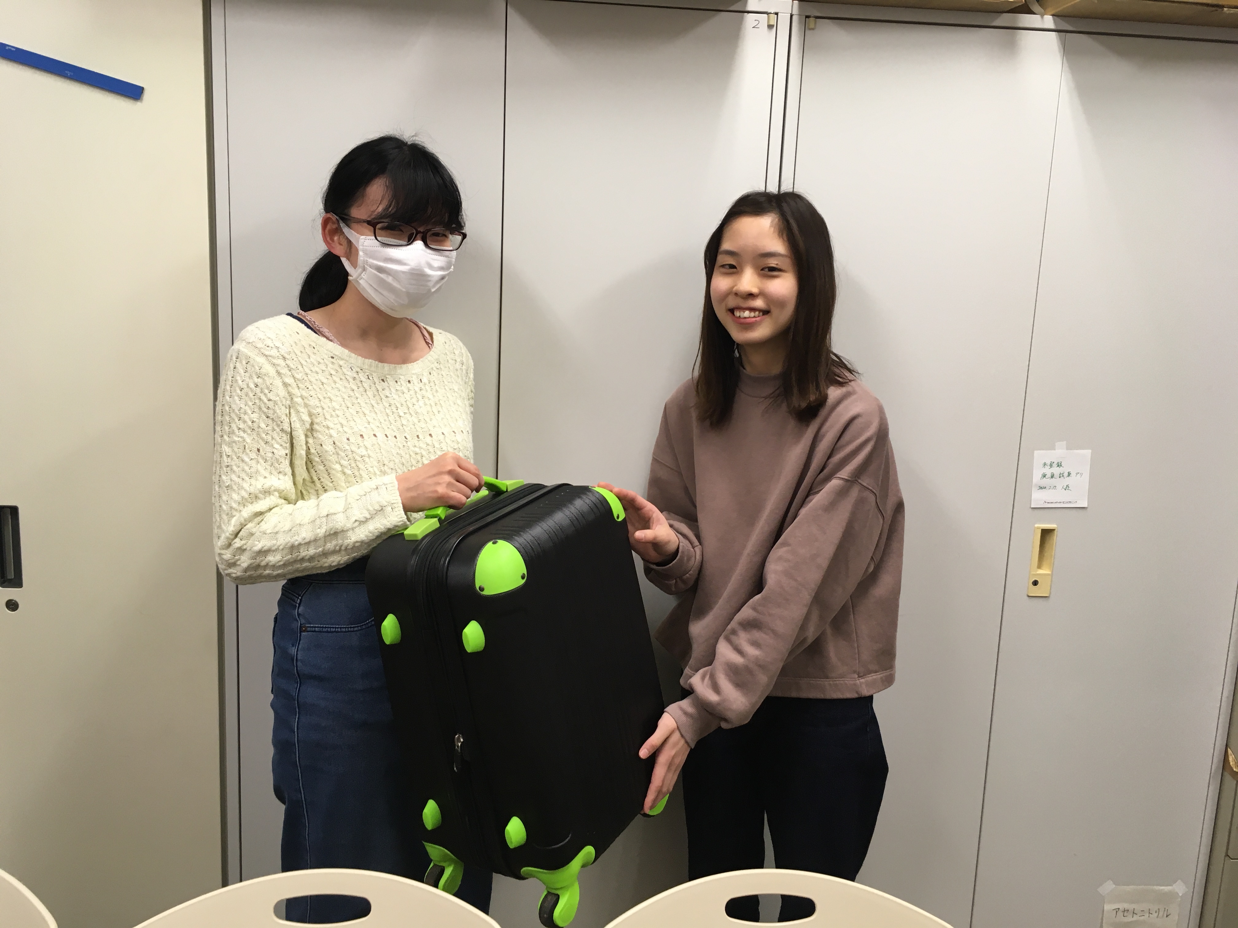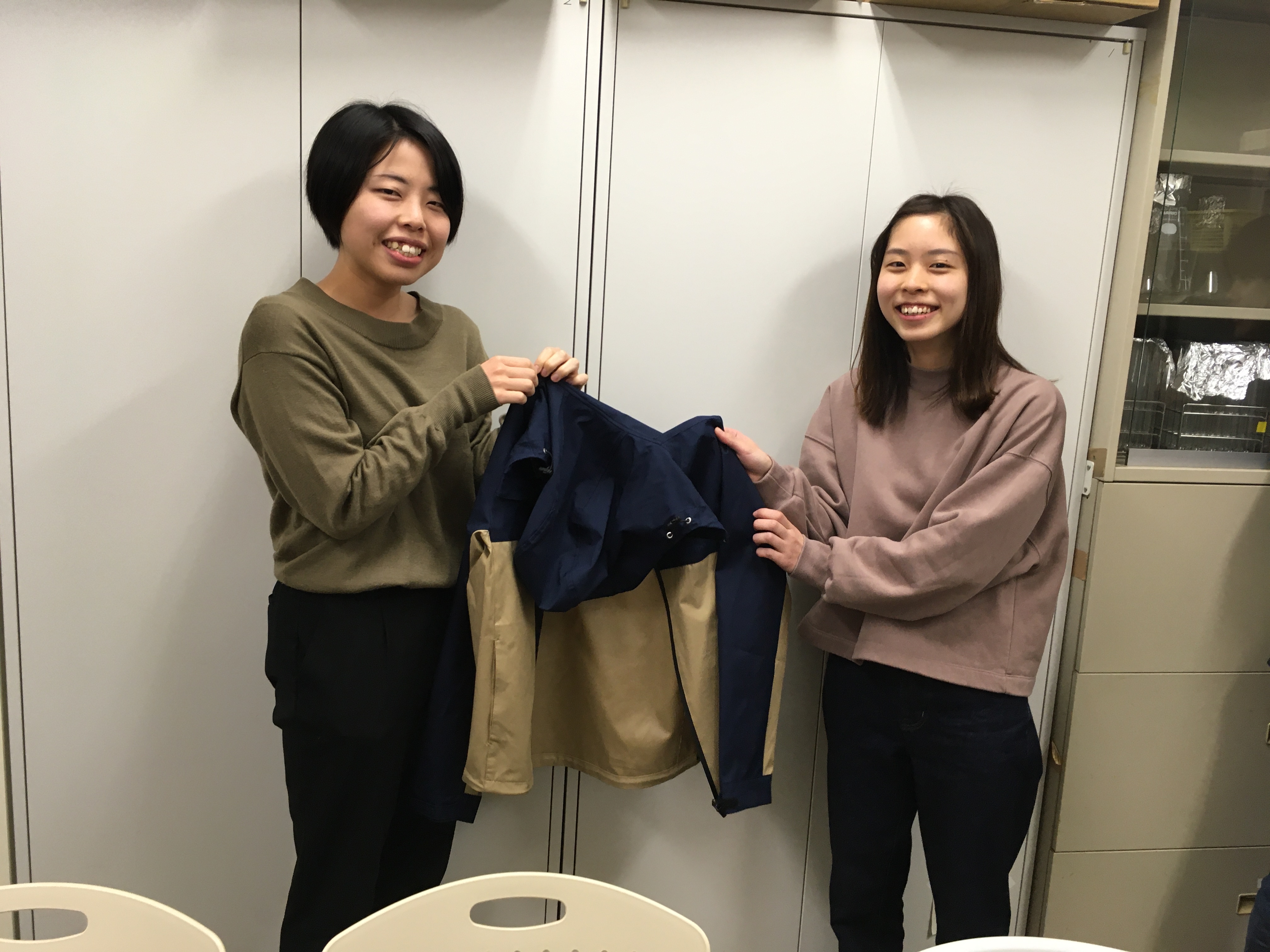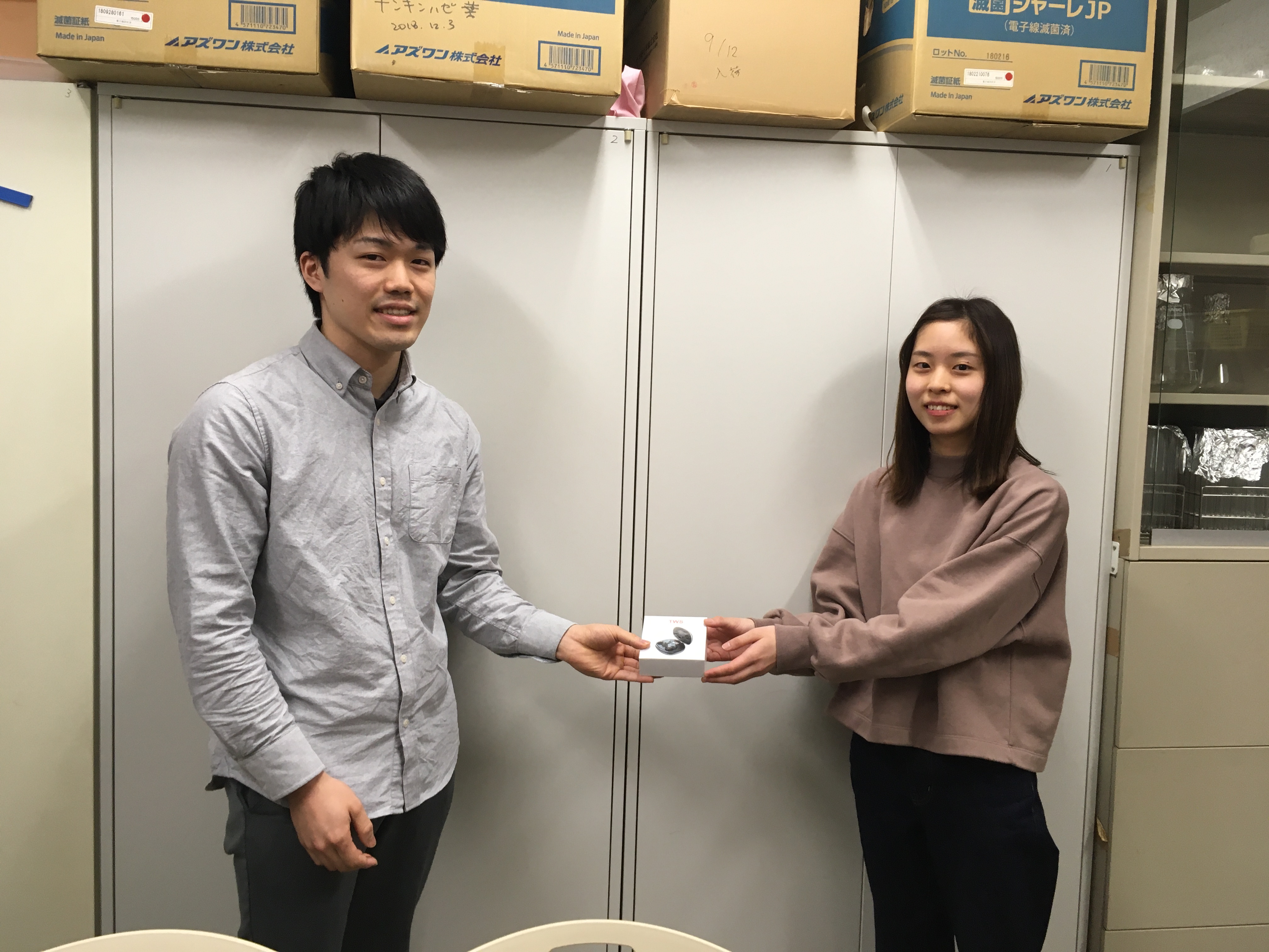 修了・卒業生と退職者に記念品を贈呈しました。研究室にタオルをいただきました。