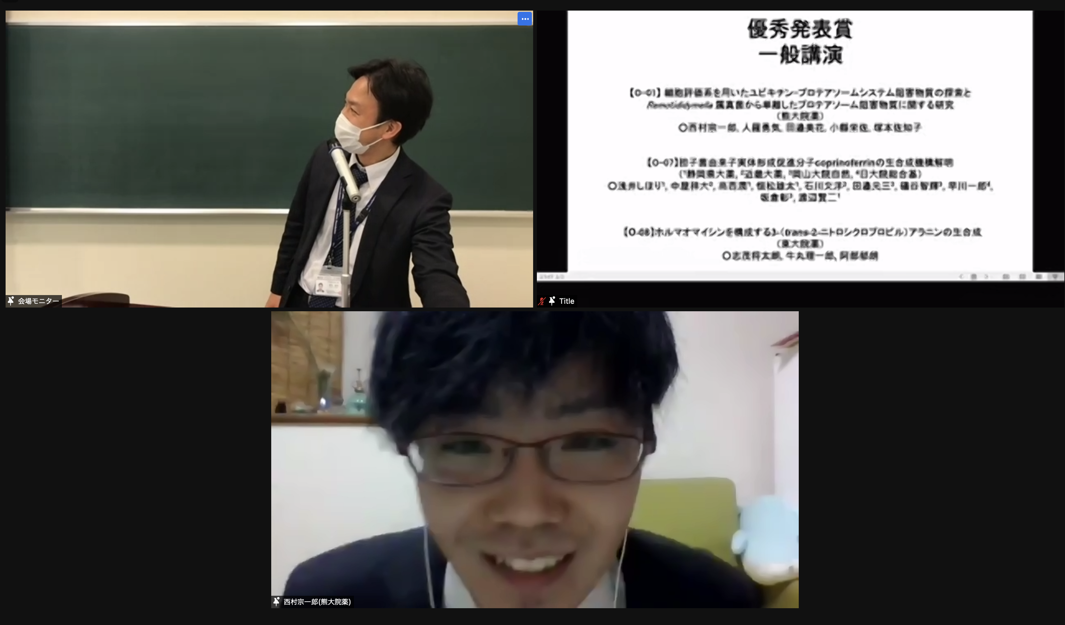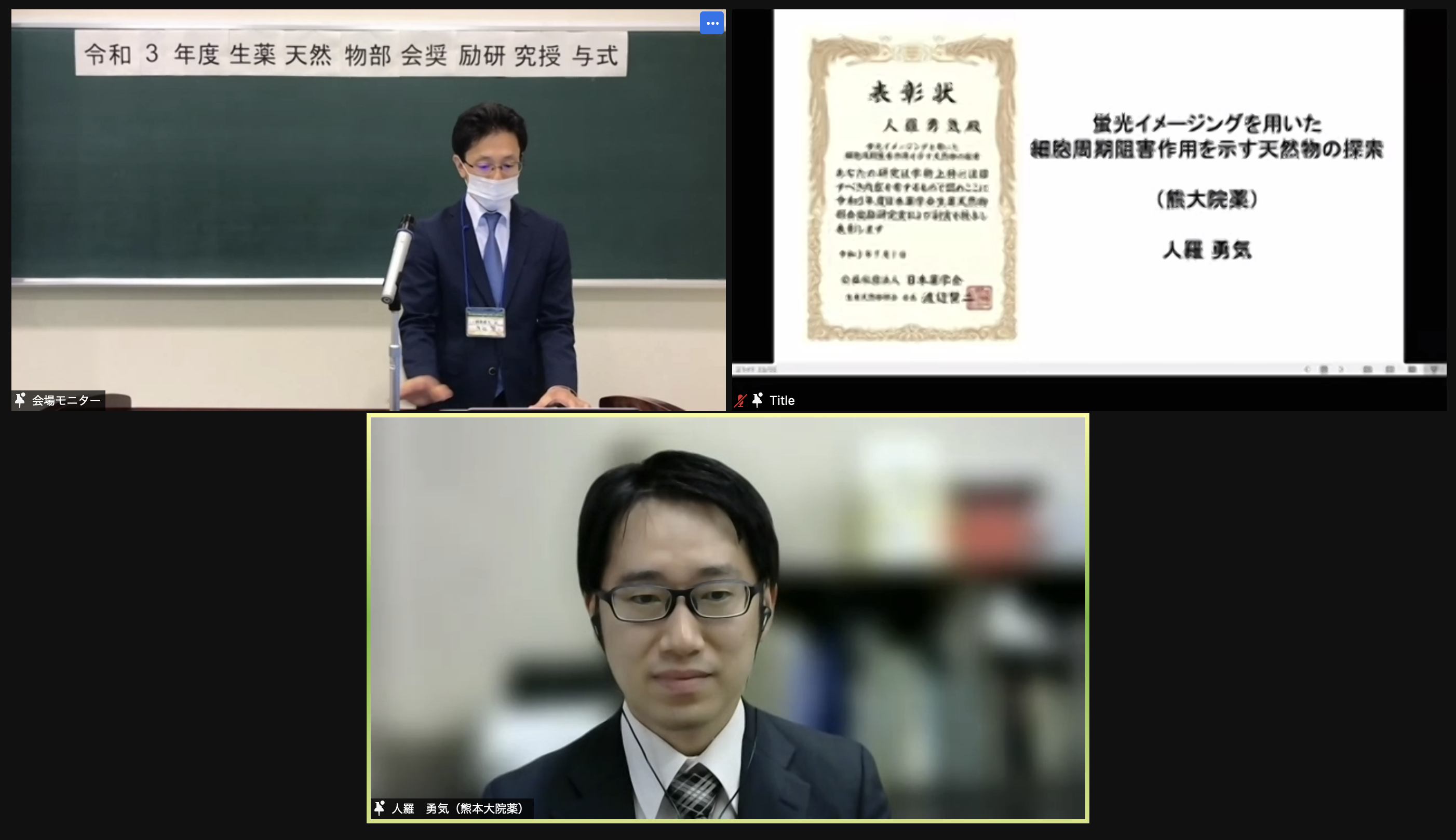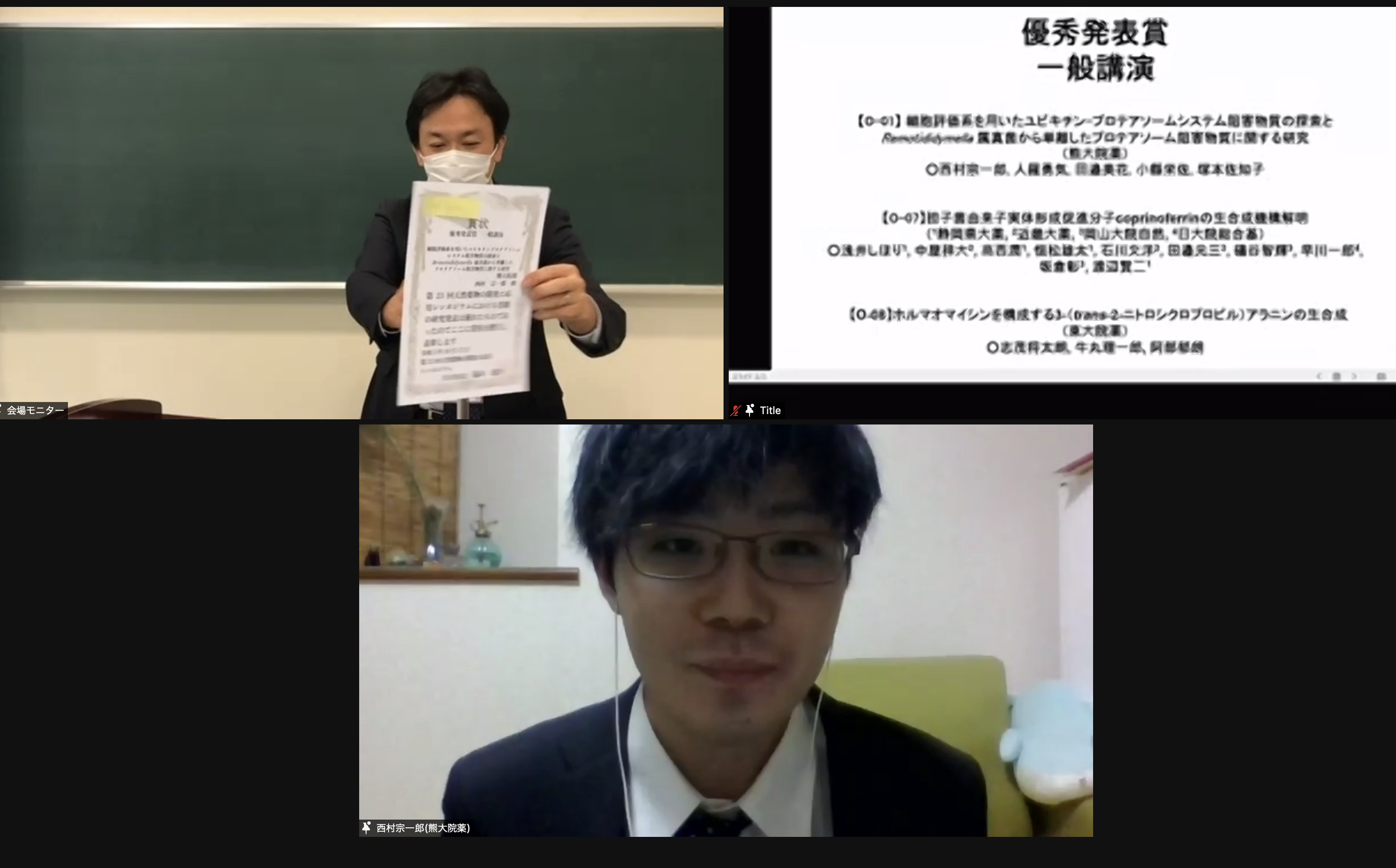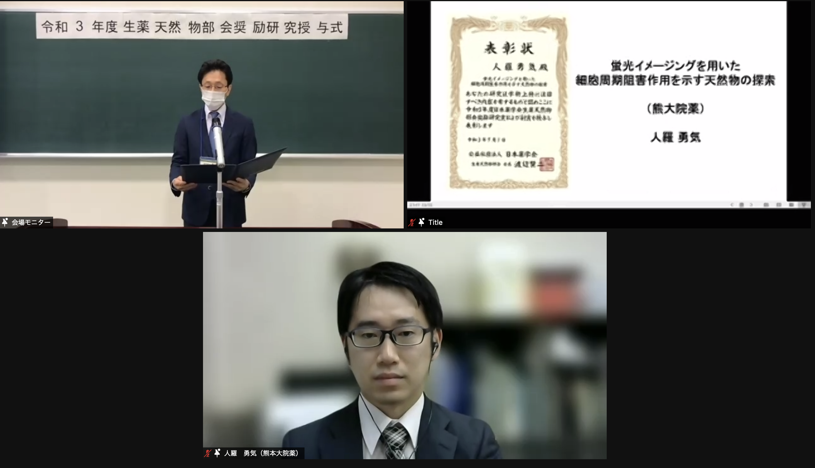 第23回天然薬物の開発と応用シンポジウムにおいて、西村君(博士前期課程2年)とAhmed博士(特別研究員)が研究成果を発表しました。西村君は優秀発表賞を受賞しました。人羅先生は、「令和3年度 日本薬学会 生薬天然物部会 奨励研究」についての受賞講演を行いました。